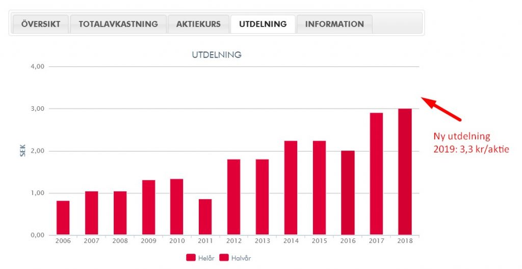 Igår åkte bolaget på en rejäl känga och kursen var vid stängning ner 24,9%. Det här gör att aktien idag handlas till en direktavkastning på över 5%. Jag har aldrig någonsin haft möjlighet att handla till på en sådan nivå då utdelningen stigit mycket sedan jag först började köpa: