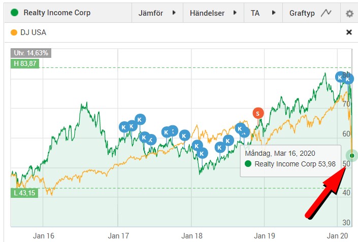 Igår när börsen i USA stängde så var min utländska REIT Realty Income ner nästan 25%. Det är givetvis en sjuk nedgång till följd av Corona, men frågan vi alltid ställer oss är om kursrörelsen var överdriven eller ej?