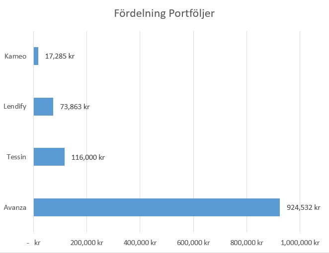 Sedan är det så att det här är totalen av alla mina portföljen men exkluderar buffert och målsparande. Det innebär att min portfölj hos Tessin, Lendify och Kameo också är medräknat. Såhär ser fördelningen ut: