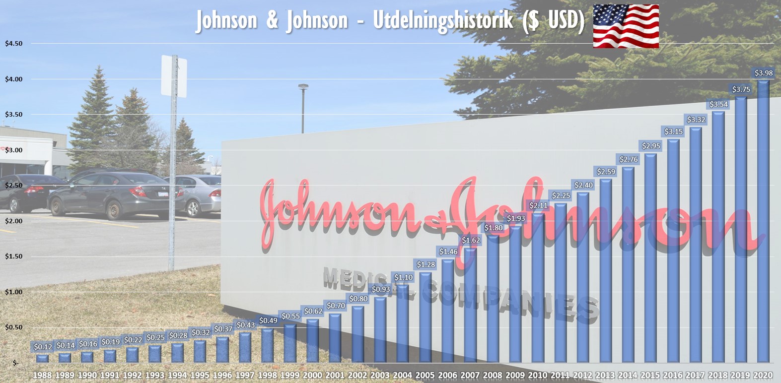 JnJ betalar utdelning 4 gånger varje år. Det klassiska är att man behåller förra årets utdelning det första kvartalet i det nya året men att man sedan höjer inför kvartal 2. Självklart är alla utdelningar inte spikat för 2020 ännu, men grafen ovan ger i alla fall prognosen (som jag för övrigt inte tror kommer ändras).
