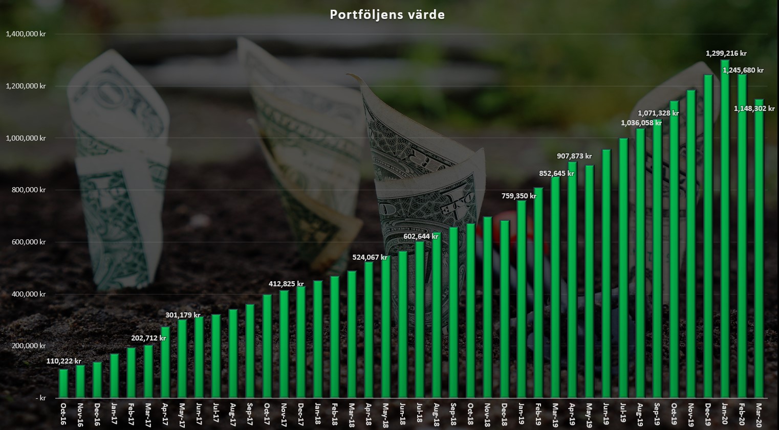 Det här blir en rätt spännande månadsrapport då mars 2020 varit allt annat än lugnt farvatten. Här presenterar jag utvecklingen av min portfölj, de utdelningar jag fått, vilka köp jag gjort samt hur värdet av portföljen utvecklats sedan start.