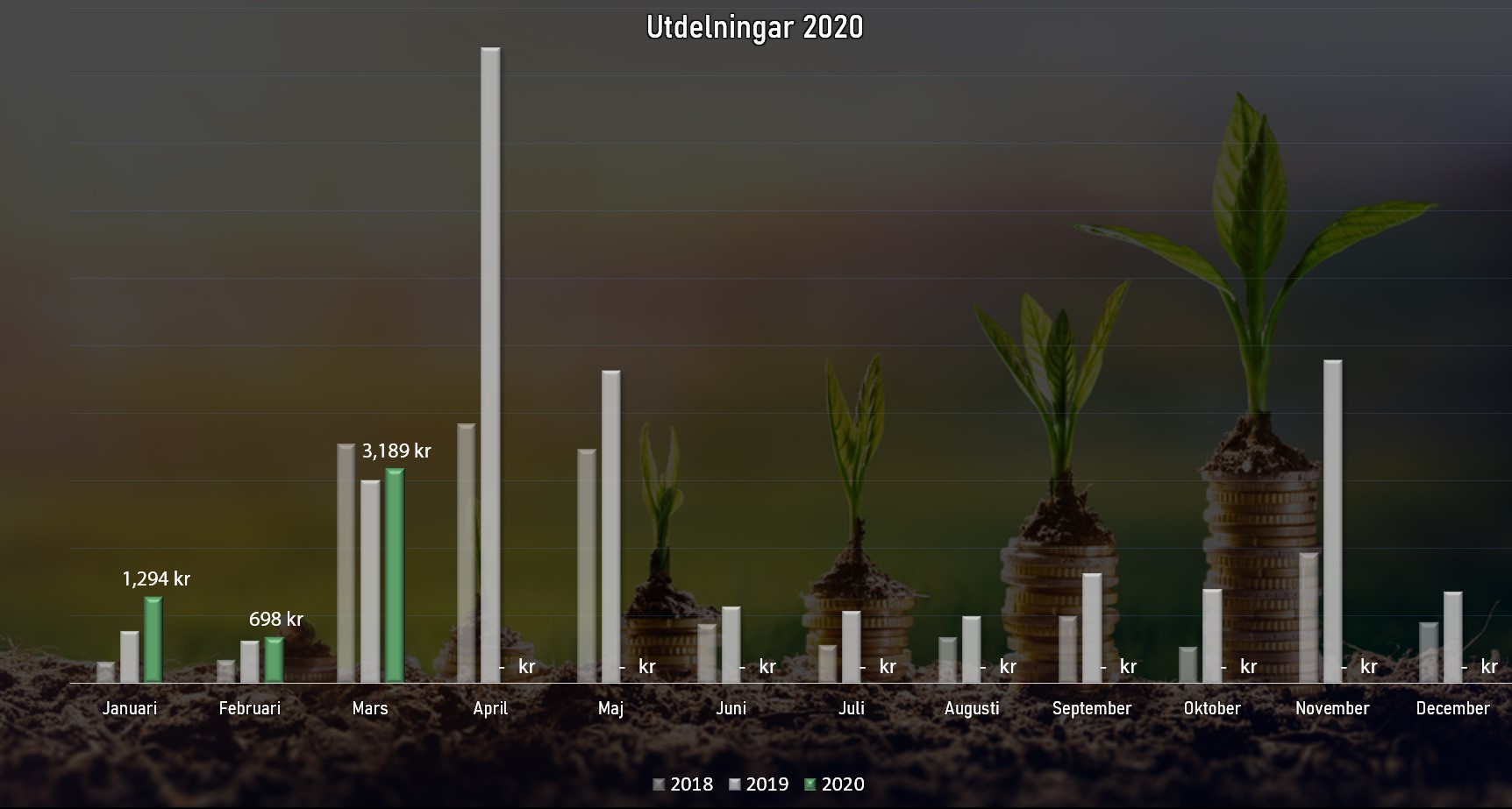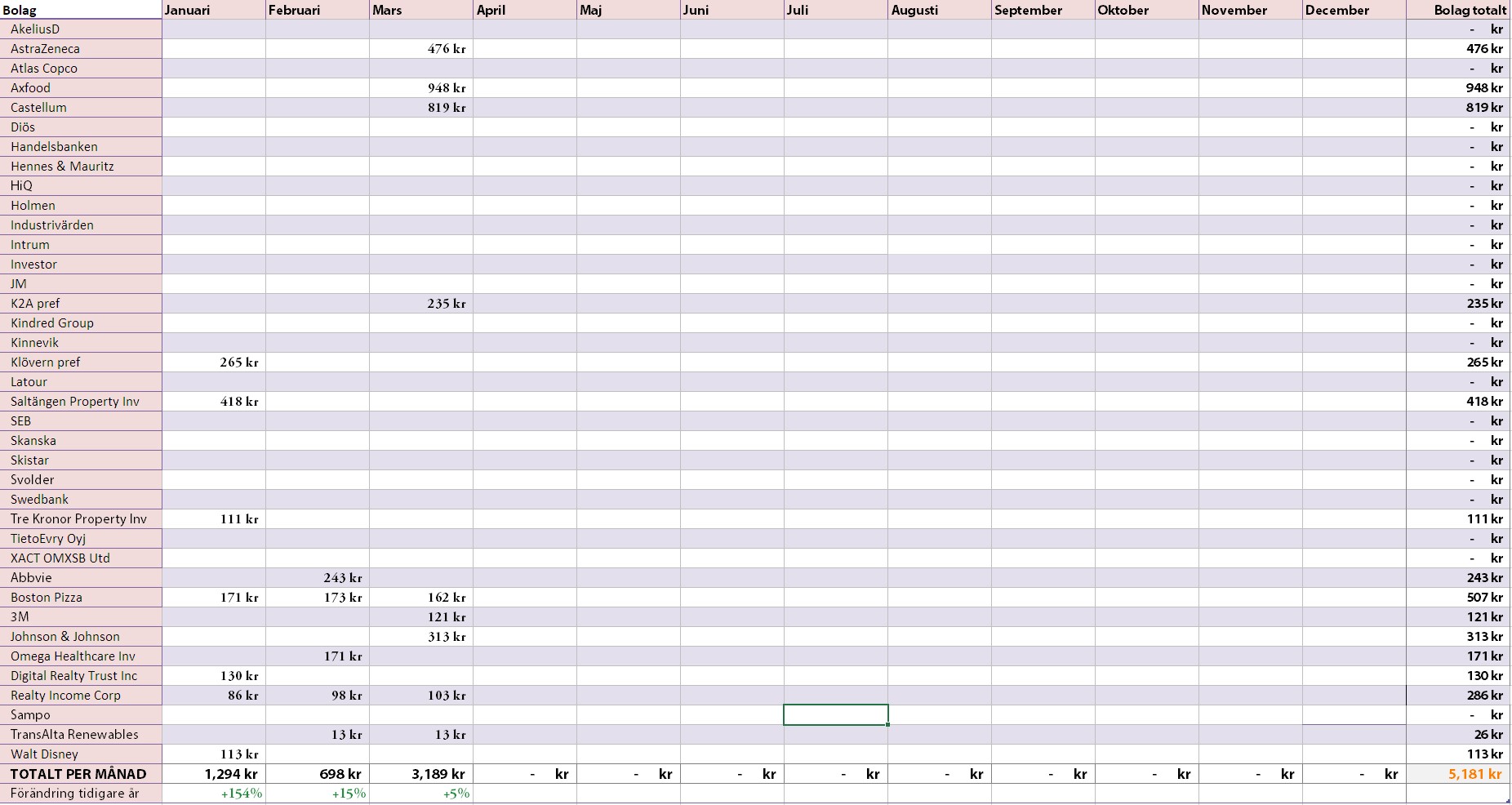 Om vi då kikar på utdelningarna för mars så har det3 189 krtotalt. Det är snäppet mer än förra året och den stora anledningen till att det inte skiljer mer är att Axfood delat upp sin utdelningen till två tillfällen i stället för ett.