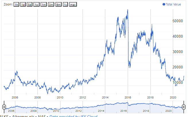 Alkermes Plc, som inte fokuserat på att höja utdelningar, har haft en betydligt sämre resa