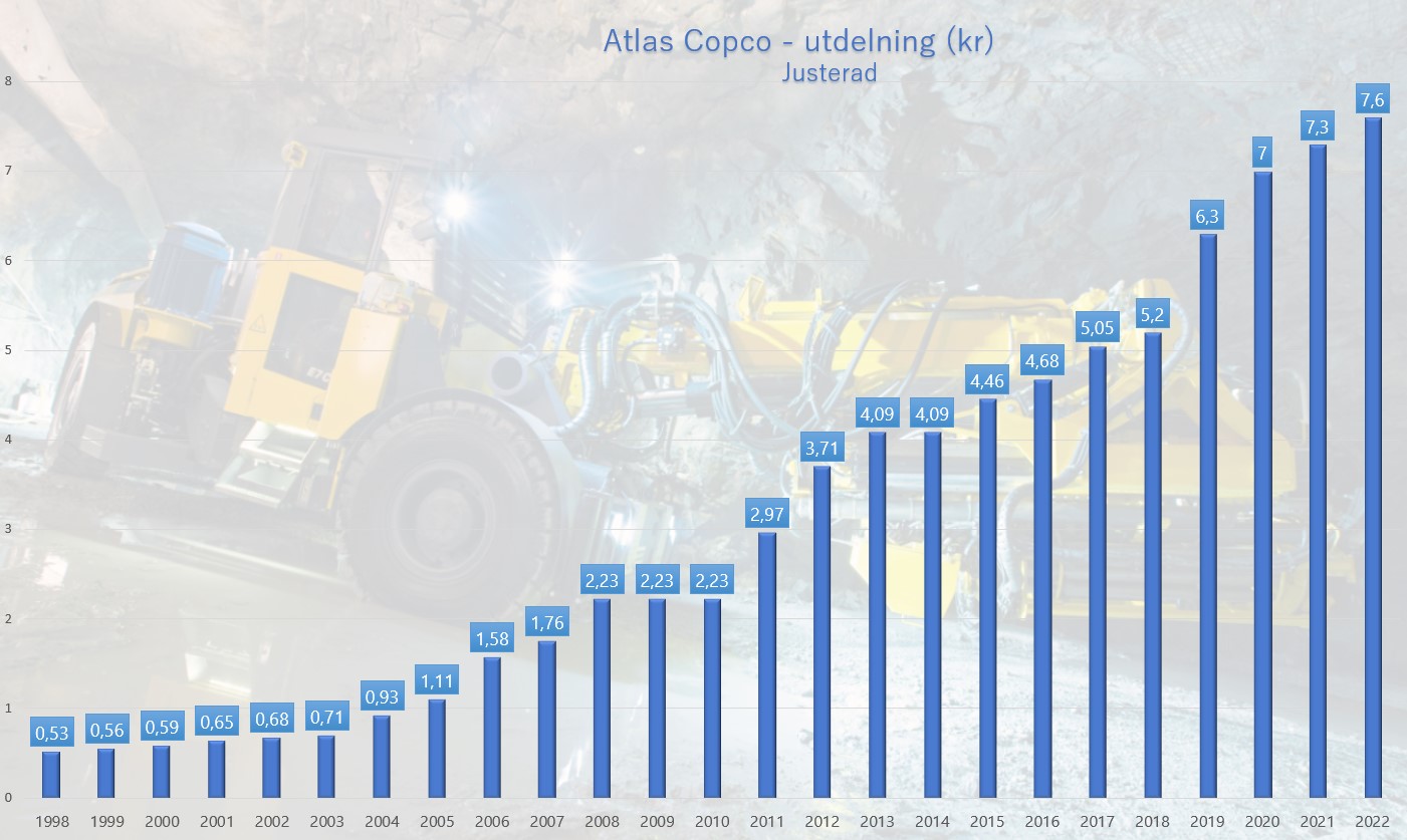 Atlas Copco:s aktie är ett typexempel på strålande utdelningstillväxt. Tyvärr bidrar det till lägre direktavkastning, idag 1,75% (ej räknat extrautdelning).
