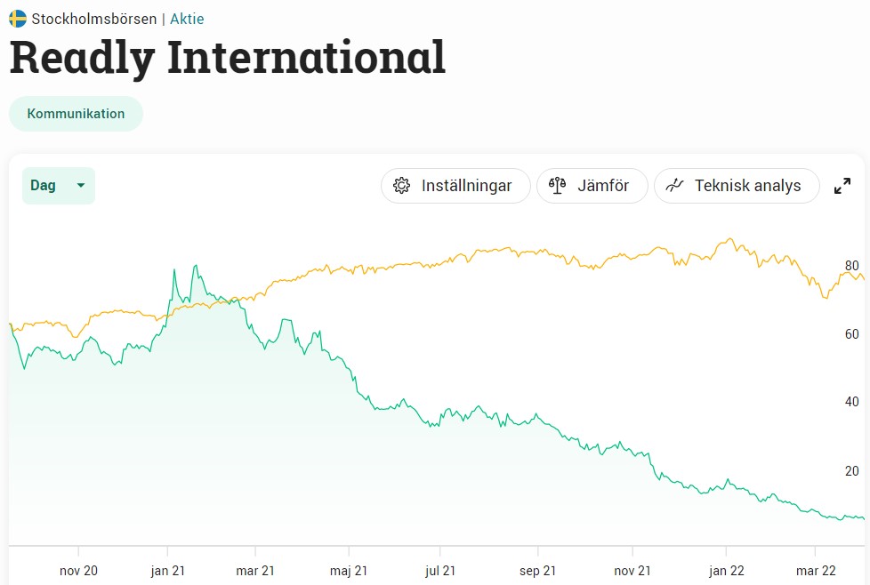 Readly är ytterligare ett skräckexempel på hur det kan gå. Tanken med Readly är god, en fantastiskt intressant tjänst att läsa tidningar i mobilen kan jag tycka. Marknaden tyckte däremot annorlunda. Nästan 90% av värdet är borta sedan noteringen.