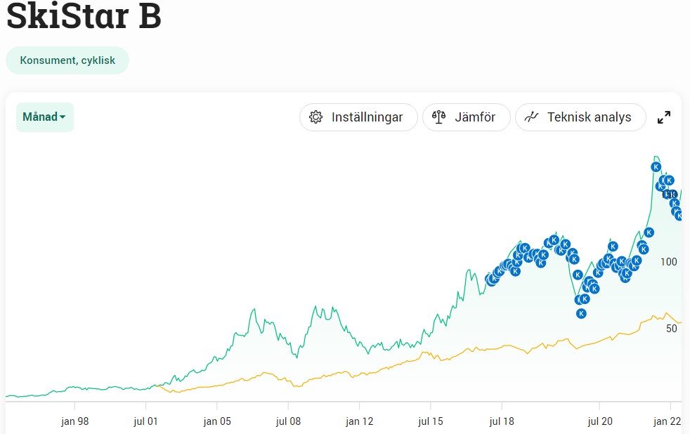 Jag kikade på Skistar och faktum är att man enbart har 0,84 i beta, vilket förvånar mig. Intrum, som jag personligen sett som mer stabil, har betydligt högre.