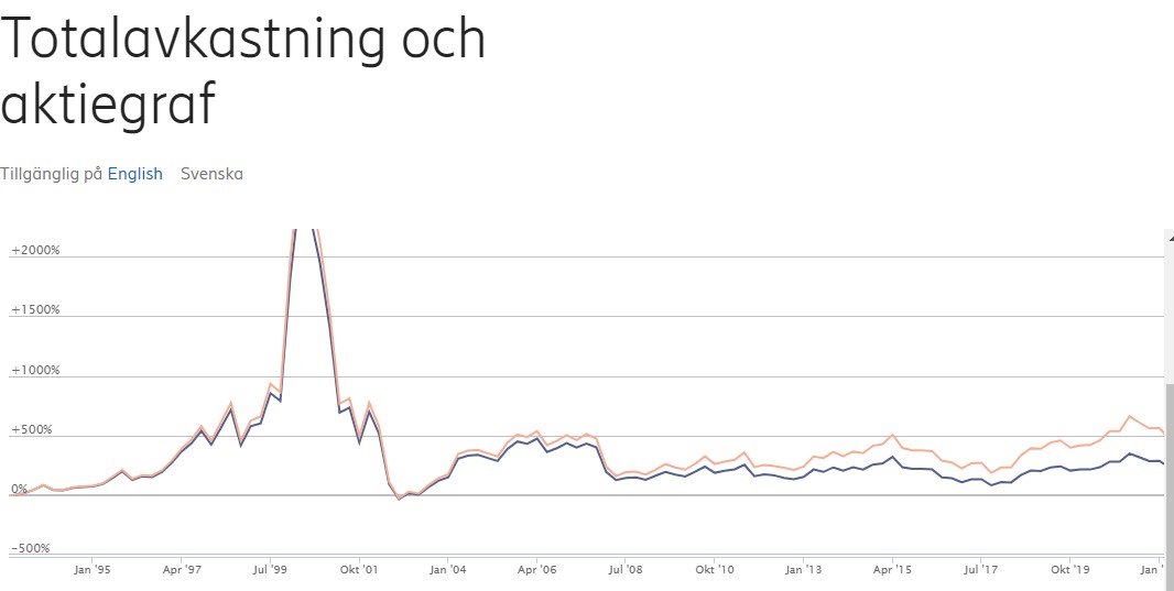 Kollar vi på Ericcson så ser vi en totalavkastning (inklusive återinvesterad utdelning) på +472% sedan mars 1993. 29 år med andra ord. Använder du min kalkylator så blir det lite drygt 6% i snitt årligen (CAGR). De senaste 20 åren har till och med totalavkastningen varit negativ.
