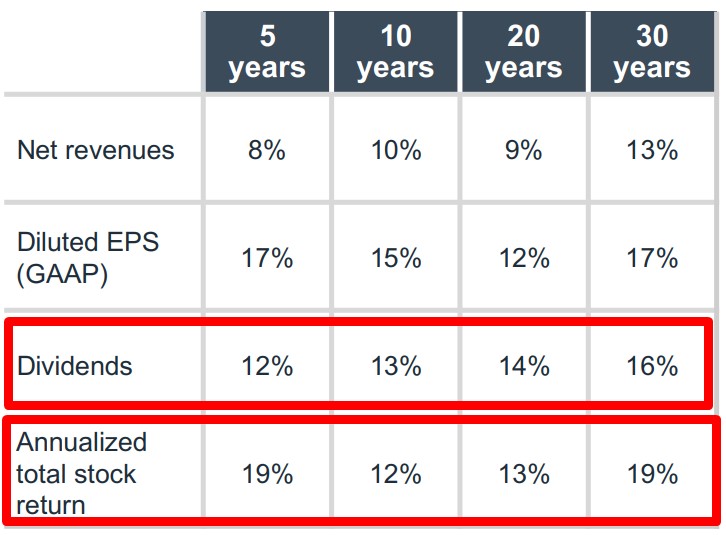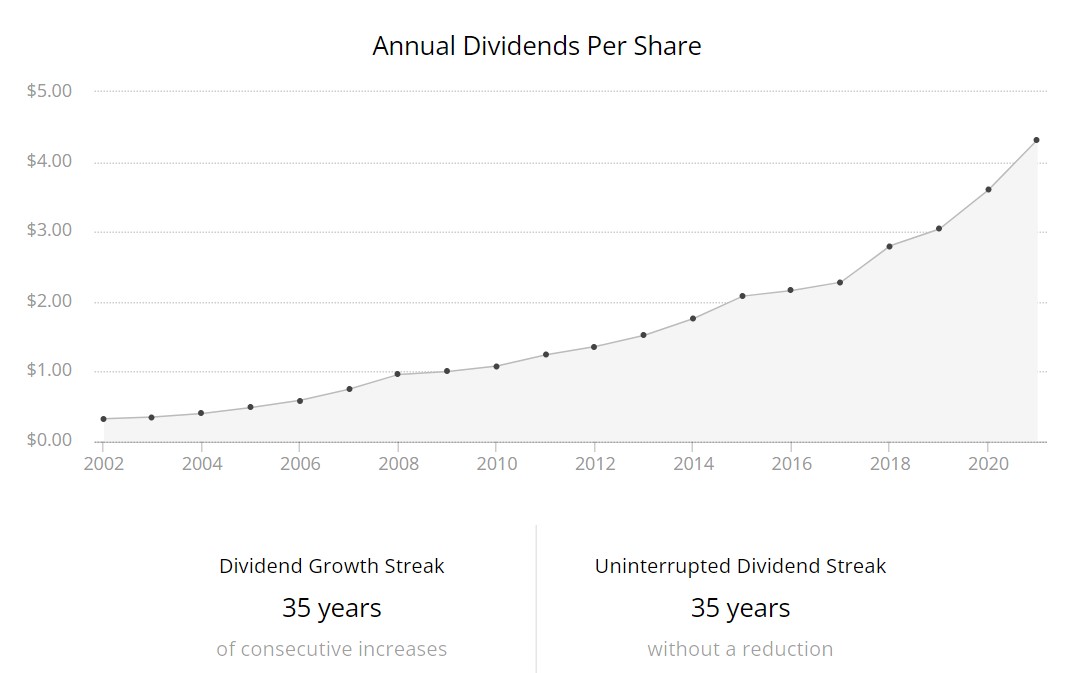 Det här är en klassisk utdelningshöjare där du får lite lägre direktavkastning (2,6% i snitt de senaste 10 åren) men en betydligt bättre utdelningstillväxt. De senaste 30 åren har utdelningen höjts med 16% årligen och totalavkastningen har varit 19% årligen.