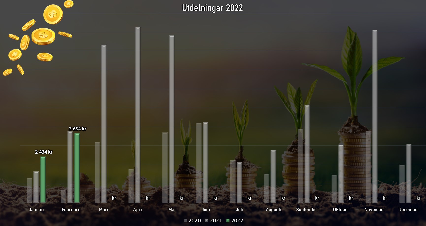 2021 är givetvis ett svårt år att jämföra med då det året innebar en hel del extrautdelningar. Målet är dock fortsatt 75 000 kr i enbart erhållna utdelningar och det har jag stor chans att räkna hem.