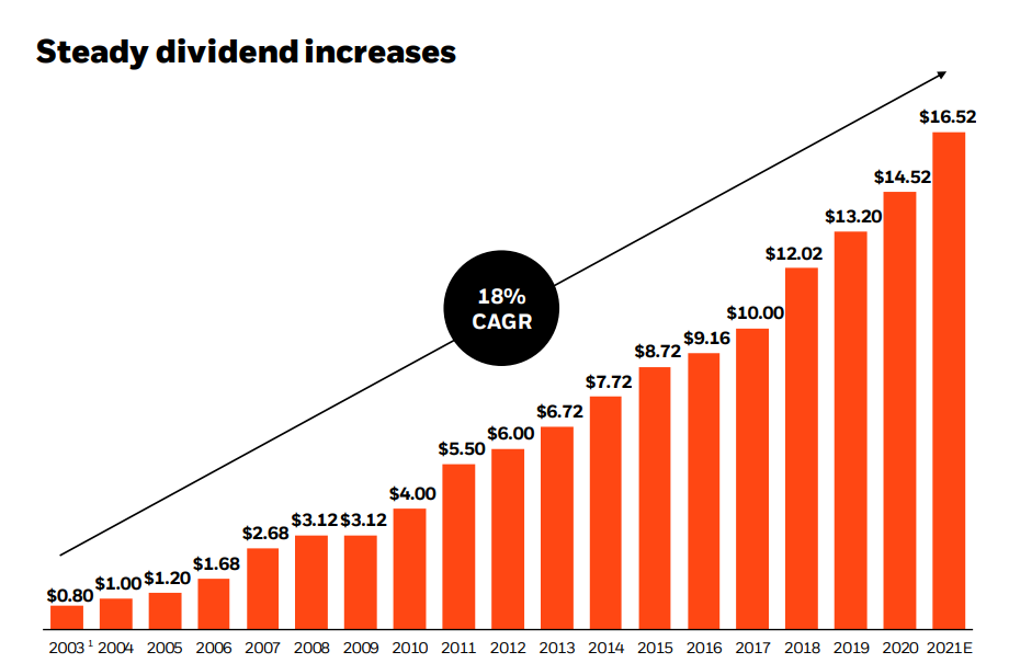 Vidare höjde man nyligen utdelningen med 18% och visar därmed att man fortsätter sin trend med enastående utdelningstillväxt.
