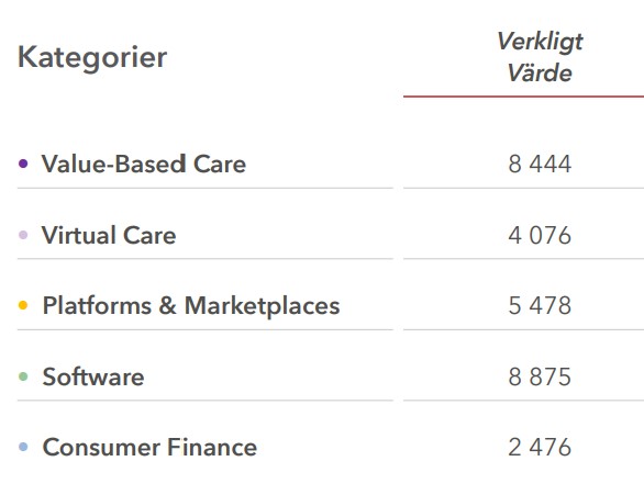 Problemet med majoriteten av innehav är att vi enbart har bedömda värden att utgå från. Största delen är värdebaserad vård där två stora bolag är Village MD och Cityblock. Village MD är en ledande amerikansk leverantör av primärvård och Cityblock verkar inom komplexa vårdbehov i storstadsområden.