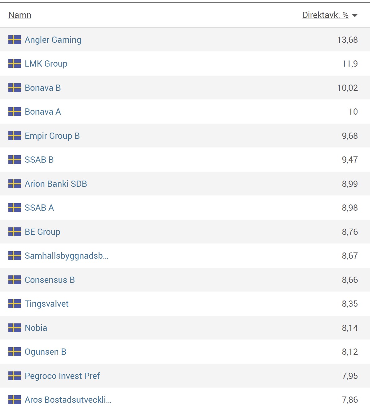 Tabell från Avanza