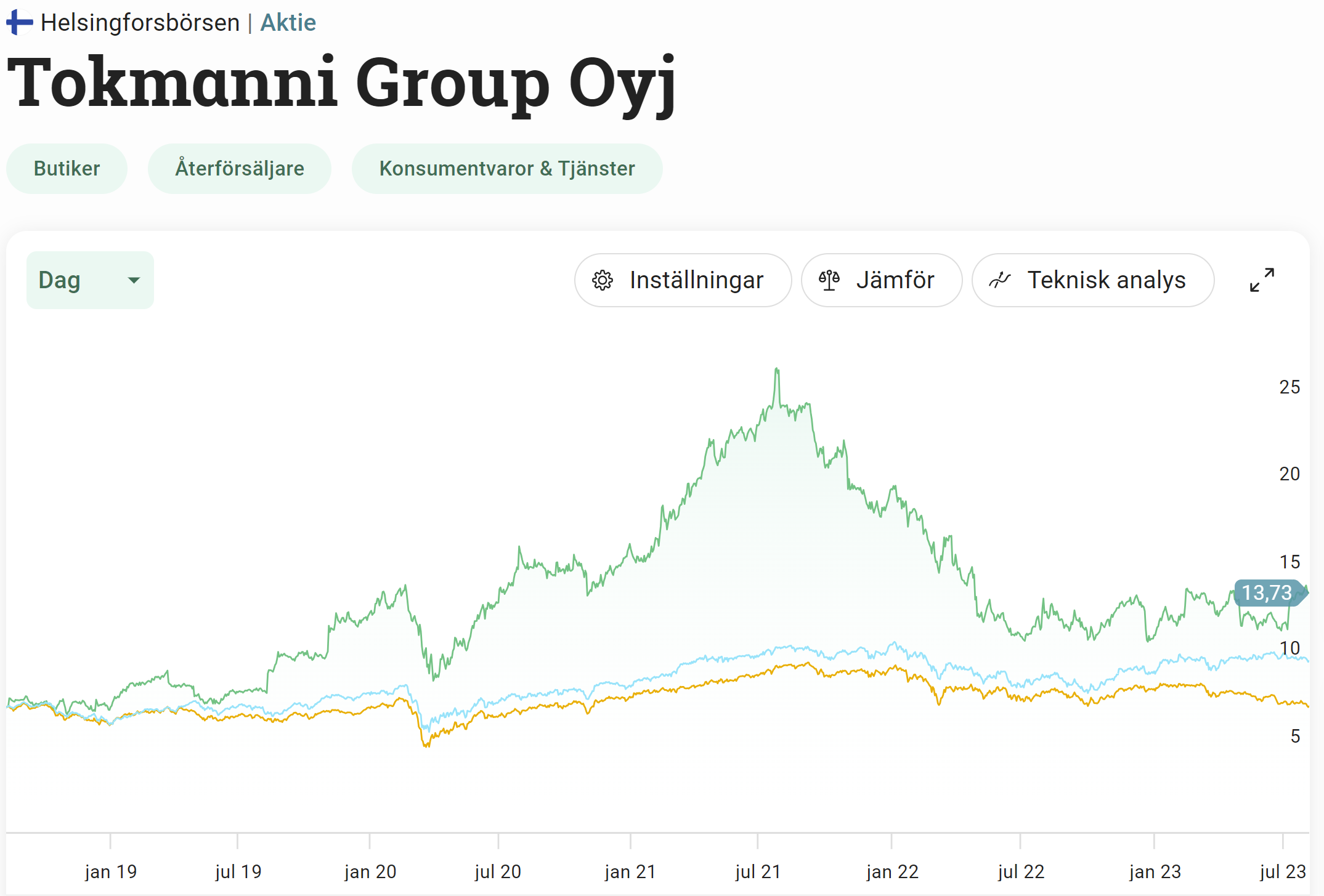 Det har inte varit en munter resa för aktien i Tokmanni de tre senaste åren. Blickar vi dock tillbaka de 5 senaste åren så har faktiskt kursavkastningen slagit OMXS30 samt OMX Helsinki 25. Då har jag inte ens vävt in totalavkastningen, alltså inklusive återinvesterad utdelning, som borde ge en extra skjuts då direktavkastningen varit högre än snittet bland övriga bolag.