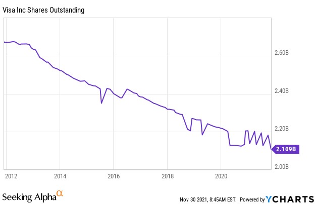 Sedan är Visa otroligt bra på att köpa tillbaka egna aktier och det är nog en trend som vi lär se fortsätta (tänk på att skalan i bilen nedan är lite lurig).