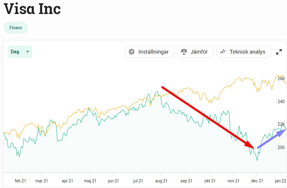 Det vi sett hända med Visa är en kraftig nedgång från förra sommaren för att nu ha studsat upp en aning (se bild nedan)