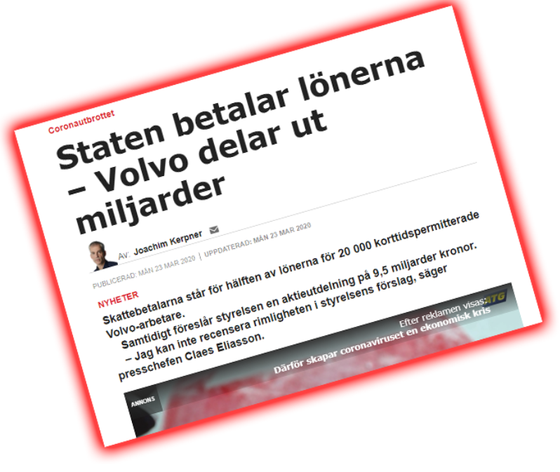 Författaren Joachim presenterade en artikel för drygt ett år sedan, i mars 2020. Joachim skrev där och då om att staten betalar löner och Volvo delar ut miljarder.