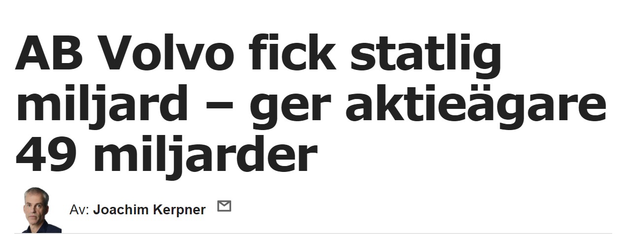 Jag misstänker att Volvo betalat skatt till staten varenda enskild månad under hela pandemin. Att de ”fått bidrag” är isåfall ganska tveksamt påstående.