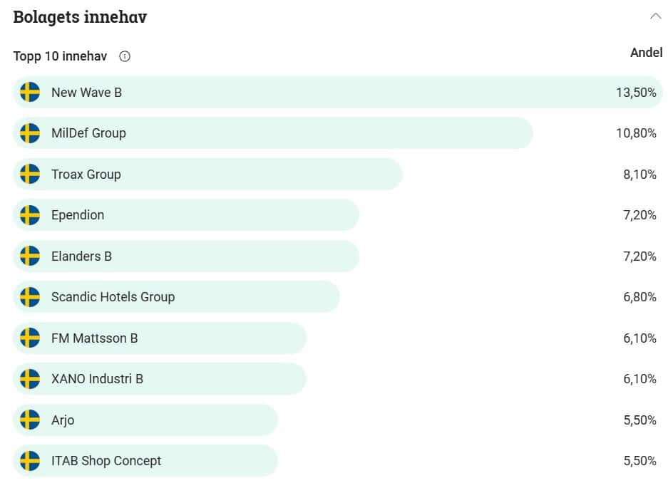 Längst ner i listan med störst premie hittar vi Latour som är lite av min favorit av dessa. Intressant är att enbart 4 av våra populära investmentbolag handlas till premie, d.v.s. att du får betala mer för själva investmentbolaget än om du handplockat var och ett av deras underliggande innehav direkt på börsen.