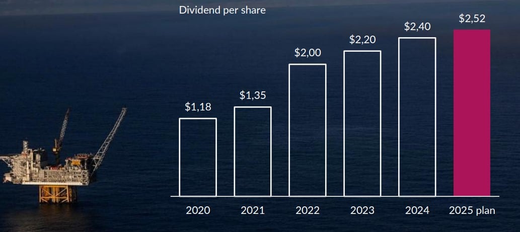 Nu är inte alla utdelningar för 2025 klara men planen är åtminstone att höja med 5% i år, trots ett fallande oljepris.