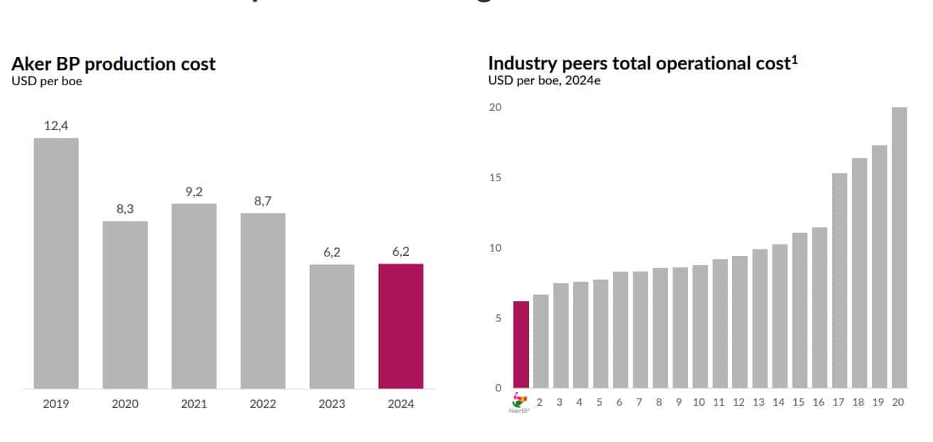 Det finns några anledningar till varför man borde äga Aker förutom den höga direktavkastningen som ser ut att vara här för att stanna. Den främsta är deras otroligt låga kostnad per fat olja som bolaget producerar. Den är helt klart anmärkningsvärd och en stor anledning till att det blir mer över på sista raden.