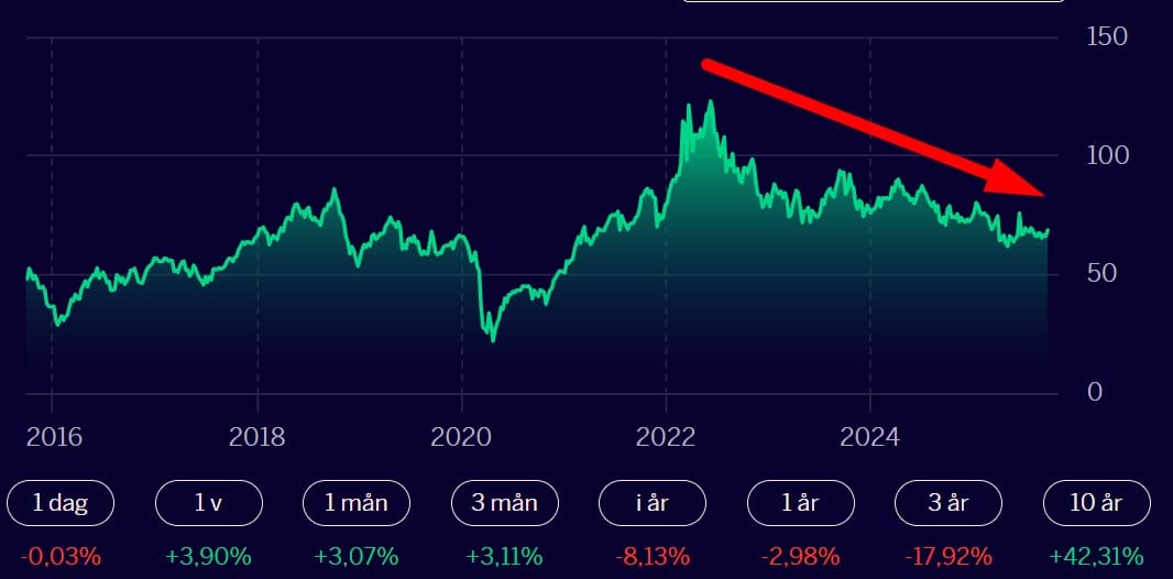 Tack vare att kursen nu gått ner 46% de senaste 3 åren så har direktavkastningen hoppat upp till 3,3%. Som vanligt finns det här en risk då marknaden förväntar sig en lägre vinst/aktie framöver och att utdelningen därigenom kan sänkas.