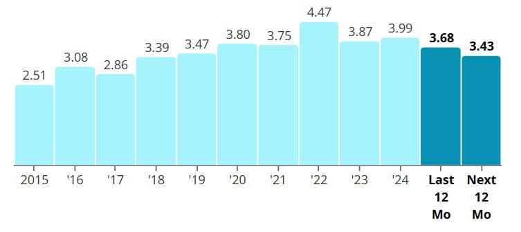 Vinsten/aktie för de första tre kvartalen ligger på 4,07 kr. Förra året hade man vid den tiden presterat 4,5 kr. Trots det spås det att Atlas Copco kommer höja utdelningen till 3,1 kr nästa år, för att 2027 dela ut 3,3 kr.