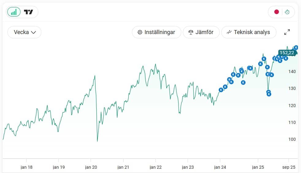Från 2017 fram till idag (8 år) så har den genomsnittliga årsmedelavkastningen varit 8,35% inklusive återinvesterad utdelning och inklusive avgift. Det är inte strålande, men ändå helt klart godkänt.