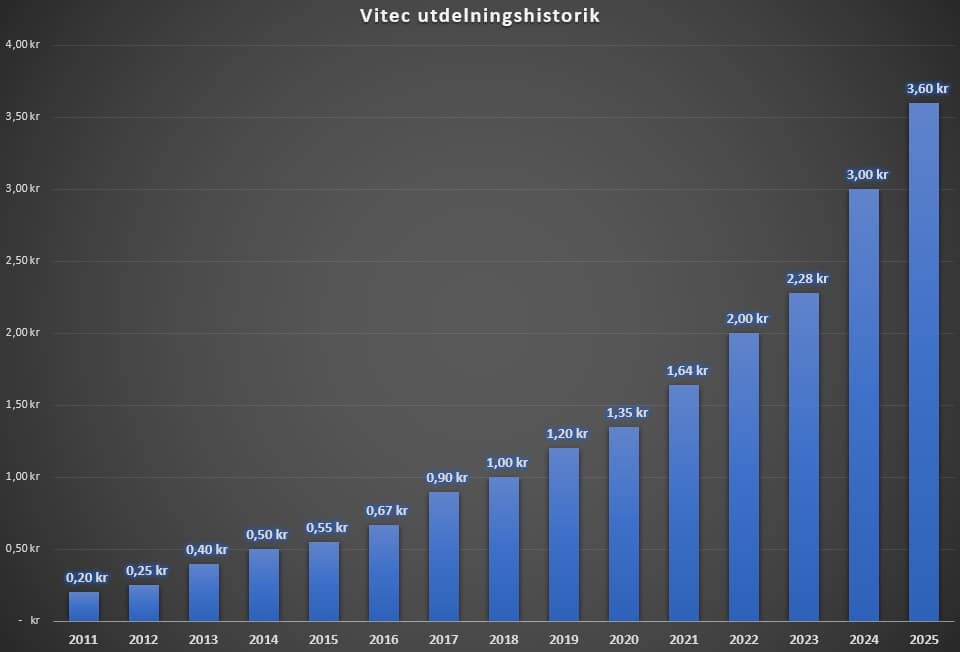 Alla år från och med 2003 har Vitec kunnat höja utdelningen. Det gör att bolaget höjt utdelningen 23 år i rad. Höjer man igen till våren blir det 24 år. Som du redan vet blir ett bolag titulerat utdelningsaristokrat när man uppnår 25 år i rad. Endast två positiva utdelningsbesked kvar med andra ord.