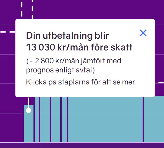 Om jag slutar jobba vid 55 så får jag enbart 13 000 före skatt, vilket såklart inte ger särskilt mycket marginal. Det är alltså 156 000 kr per år före skatt.