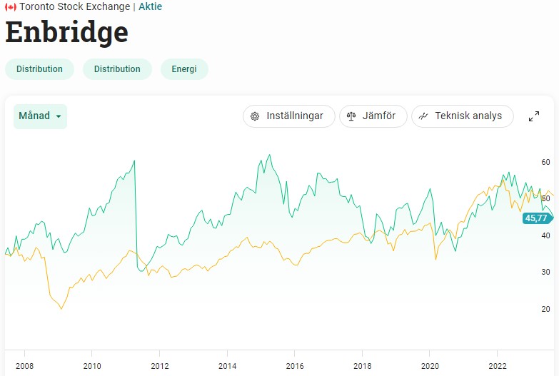 Nu när marknaden har sitt fulla fokus på AI så glöms dessa lätt bort. Till skillnad från tech aktierna har ENB inte haft någon strålande kursutveckling under många år, men så är det oftast med den här typen av bolag där en stor del av kassaflödet delas ut. Transportbolag av energi är allt annat än en spännande bransch.
