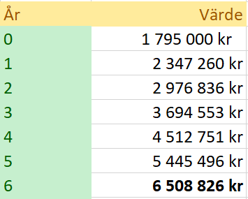 6 508 826 * 6% = 390 500 varje år