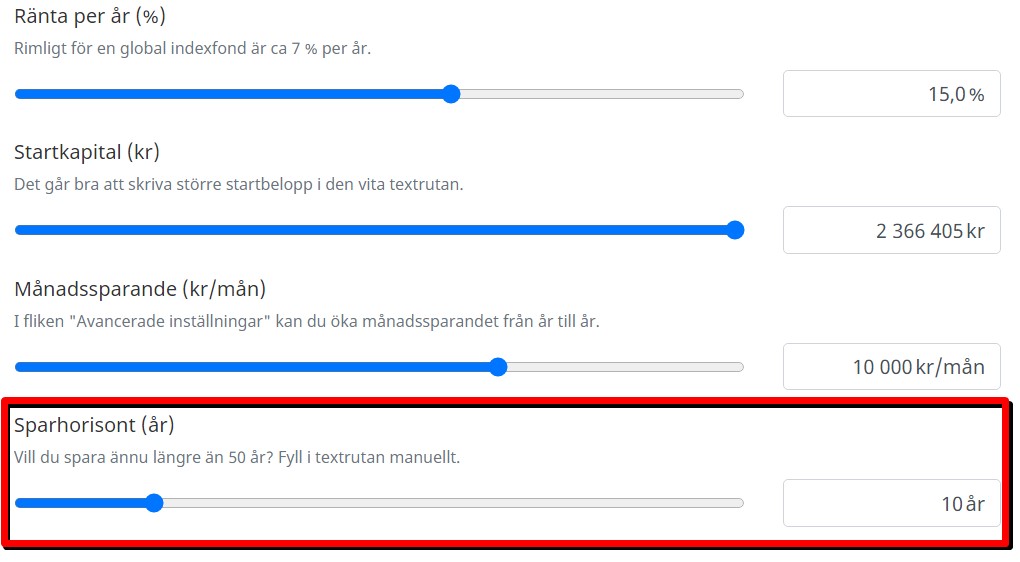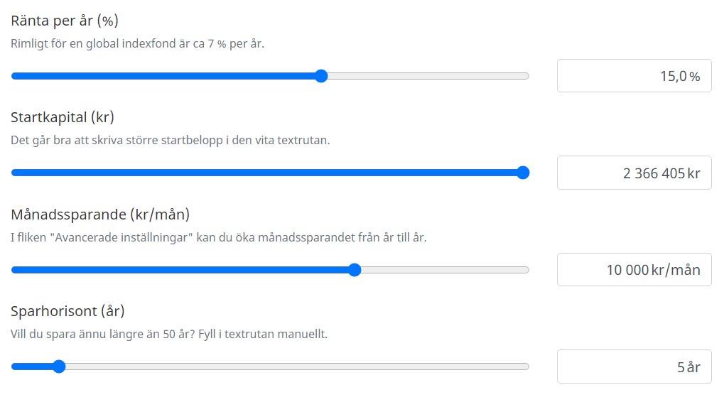 Självklart är det här den svåraste faktorn att beräkna. Det är betydligt lättare att påverka ditt sparande än själva avkastningen. Blickar vi tillbaka de senaste 3 åren har jag gjort 50% på börsen. Använder du min kalkylator så ser du att det blir 14,5% årligen.