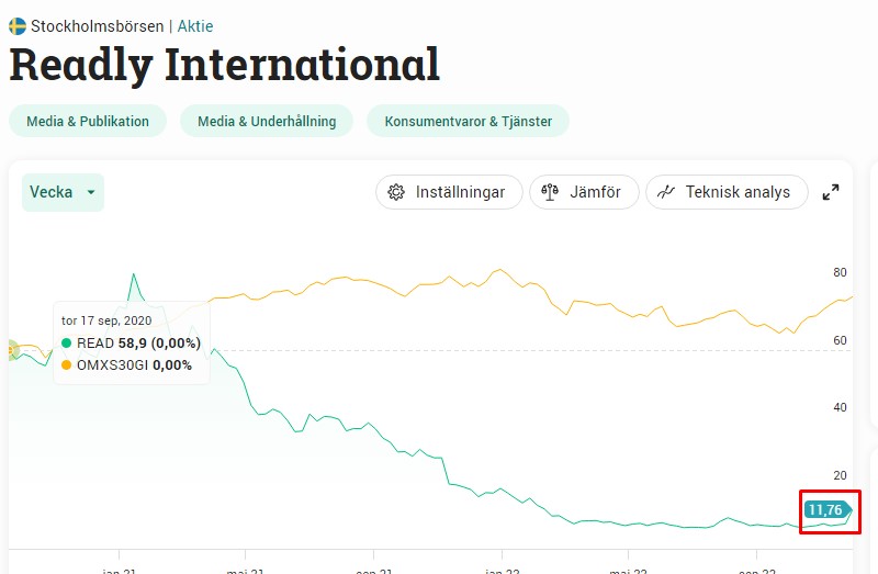 Nu lägger alltså Bonnier genom dotterbolaget Bonnier News ett bud på 12 kr/aktie på Readly. Det här motsvarar då en premie på 59.3% och aktien är upp 55% idag. Jämfört med snittkursen senaste 60 handelsdagarna var premien 70% och senaste 120 dagarna landade premien på 60,1%.