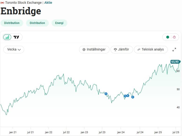 Bland utländska innehaven som delar ut i september är Enbridge en av mina favoriter. Det här är ett så kallat midstream bolag inom energi. Väldigt kort förklarat är det här bolag som hanterar transport av energin, antingen genom rör, lastbilar, järnvägar till sjöss eller annat.