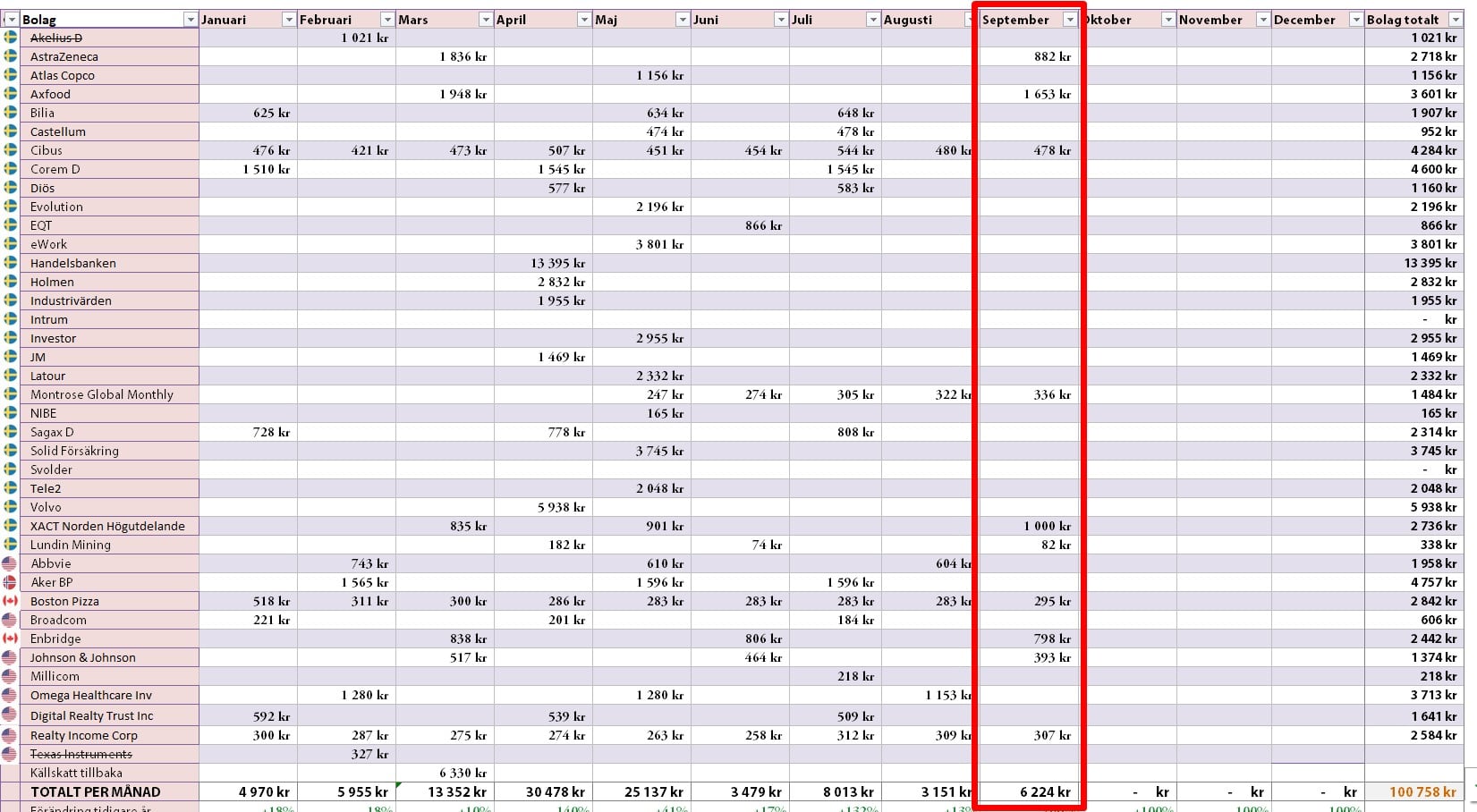 Min egna portfölj väntas pynta drygt 6000 kr i utdelning under september. Den totala summan av alla utdelningar för året blir då ganska exakt 100 000 kr. Men sedan kommer oktober och november som för mig är väldigt utdelningstunga månader.