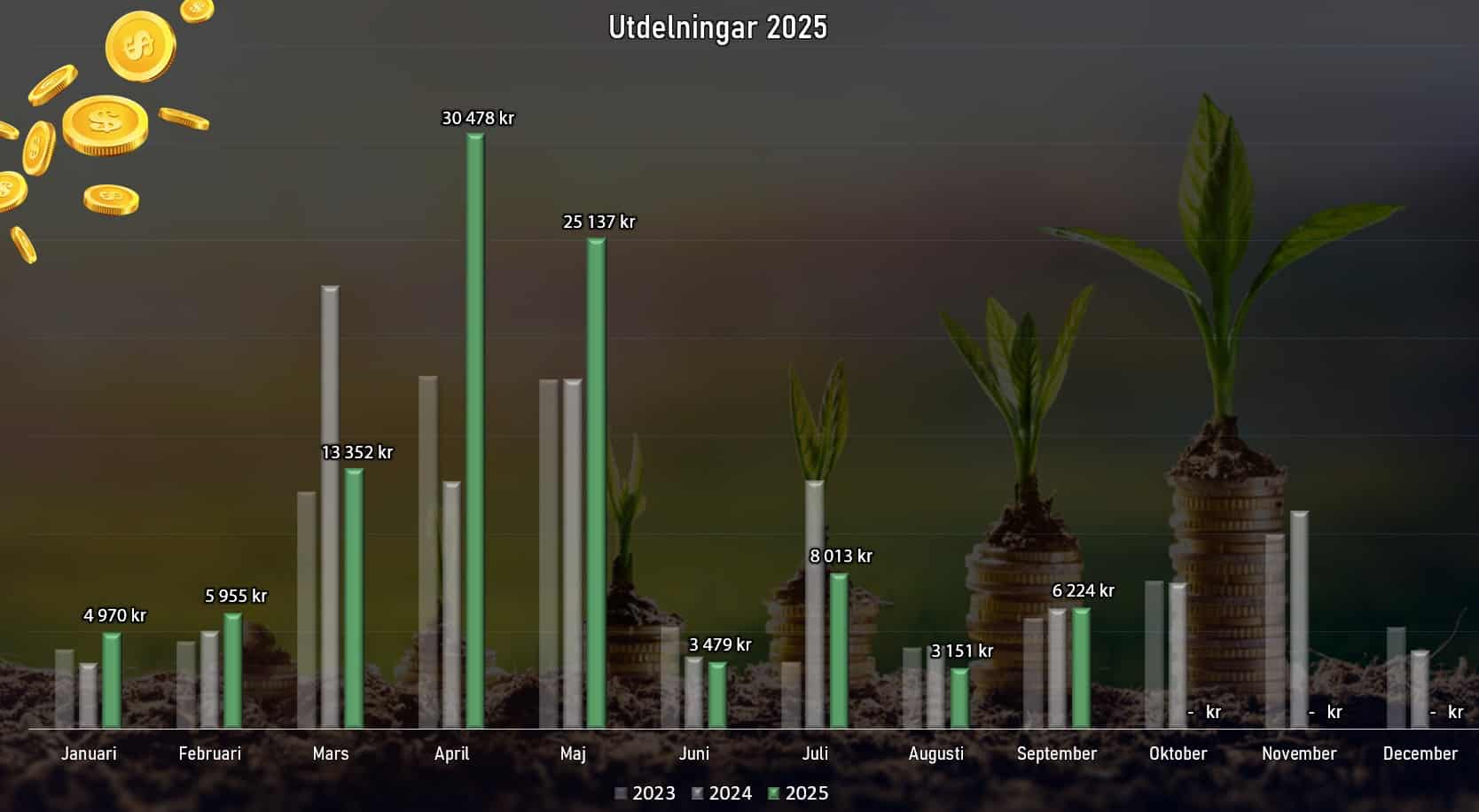 Hur mycket respektive månad erbjudit i utdelning kontra de två senaste åren