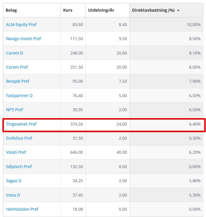 Tingsvalvet Pref är nu tillsammans med Cibus de enda svenska månadsutdelarna. Antal aktieägare har skjutit i höjden och direktavkastningen är nu bland de lägre för preferensaktier och D-aktier. Intea D och Sagax D har fortfarande lägre, men frågan är hur väl Tingsvalvet Pref förtjänar kursrusningen. Många köper nog denna för månadspengen.