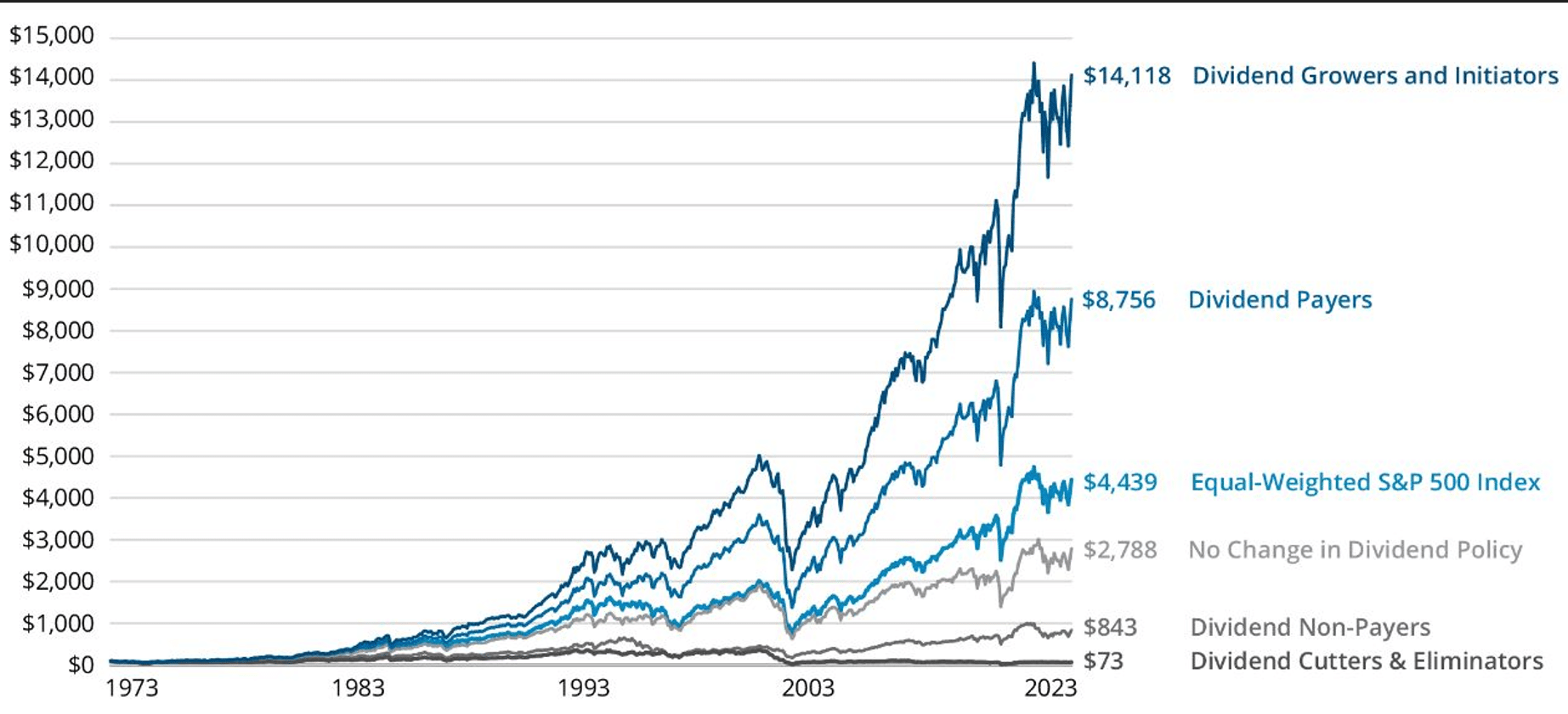 Det här är också anledningen till varför jag menar på att du bör satsa på bolag som höjer sin utdelning rejält om du har tiden på din sida. Utklassningen är enorm. Investerade du i den kategorin år 1973 med $100 så har kapitalet vuxit till $14.118 år 2023. Då har du enbart återinvesterat utdelningen under den tiden.