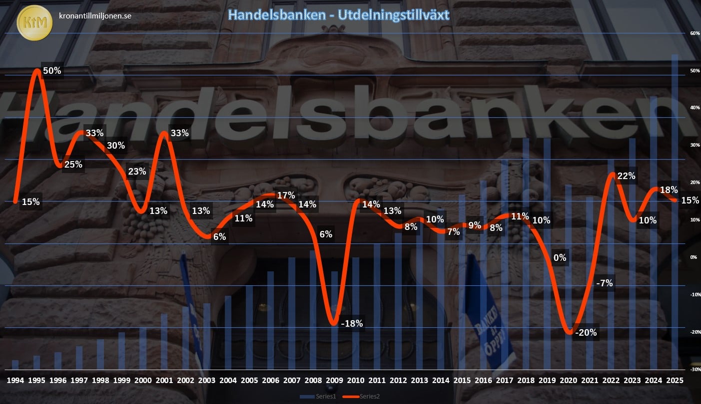 2025 – Handelsbanken skickar ut en total utdelning på 15 kr/aktie. Av detta är 7,5 kr ordinarie och 7,5 kr extrautdelning