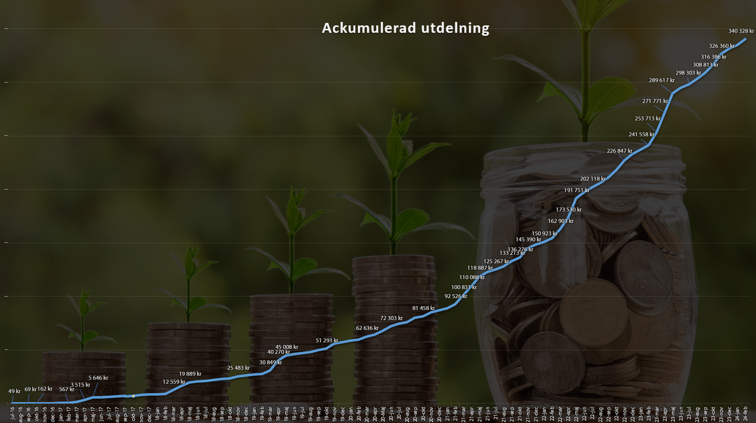 Det som är härligare att kika på är den ackumulerade utvecklingen, d.v.s. summan av alla utdelningar över tid. Att grafen bara går brantare och brantare, ja det är en effekt av ränta-på-ränta inom utdelningsvärlden.