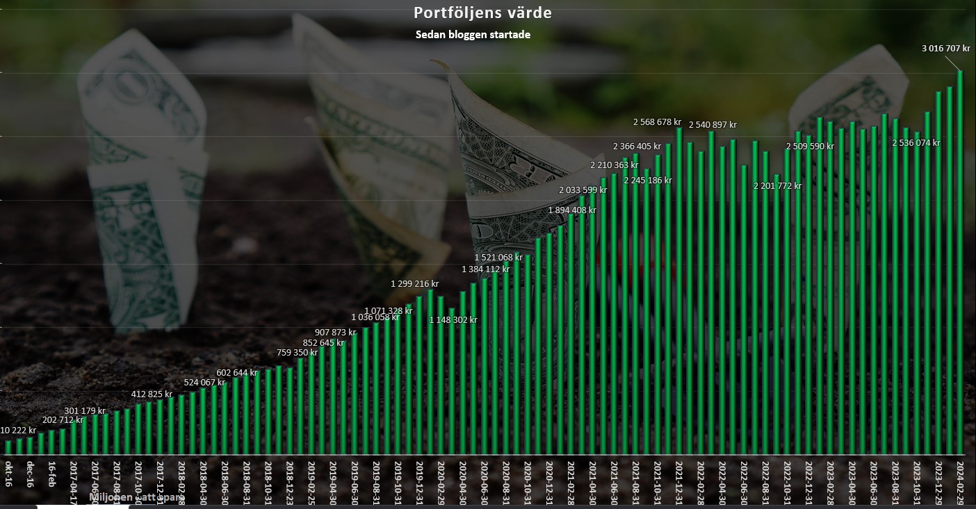 Herrar och damer (de få som faktiskt läser bloggen). Det är nu officiellt. Portföljen har slagit över 3 miljoner svenska kronor, och det med marginal. Var det här någonsin min föreställning när jag köpte mina första Avanza Zero för 100 kr i slutet av 2016? Solklart är att portföljen fått sitt egna liv och levererar likt aldrig förr. Den bara rullar fram, och tar mig till ställen bara drömmar kan.