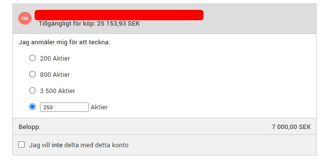 Jag valde att teckna mig för 250 aktier. Totalt blir det 7000 kr, vilket känns som en rimlig summa. Mest troligt lär jag inte få något alternativt bara delar av det