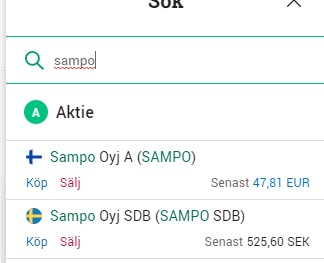 Kostnader som tillkommer på Nasdaq Helsinki till skillnad från Nasdaq Stockholm är valutaväxlingen, 0,25% i vardera riktning eftersom Sampo handlas i euro. Så vill man tradea aktien så passar den svensknoterade bättre, beroende på vad kund har för courtagevillkor så kan även det bli skillnad (våra ordninare courtageklasser gör dock ingen skillnad på Nasdaq Stockholm och Helsinki)