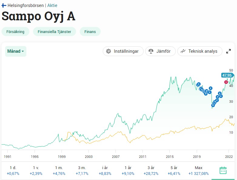 Sampo är ett bra bolag att ha i sin utdelningsportfölj. Jag skulle nog köpa den på finska börsen. Jag vet att många tycker det är jobbigt med källskatt men är man långsiktig och uthållig så är det ett mindre bekymmer i mitt tycke.