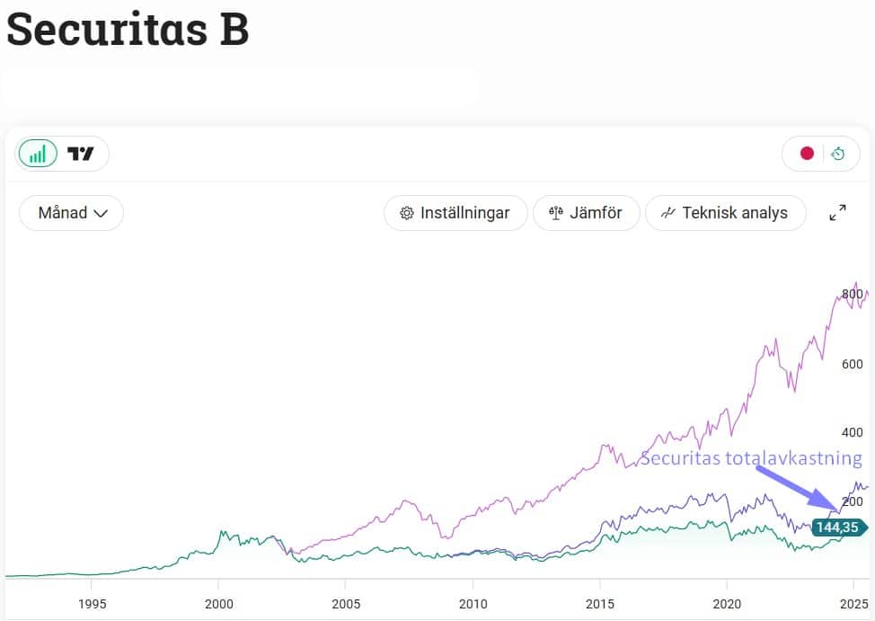 Nyligen har det pushats ut många positiva analyser om Securitas. Visst är det så att Securitas nu verkar som ett bättre bolag än tidigare, med växande marginal och en teknikdel som också är intressant. Samtidigt har aktien inte presterat allt för bra på lång sikt och därmed har jag skippat gå djupare in i bolaget.