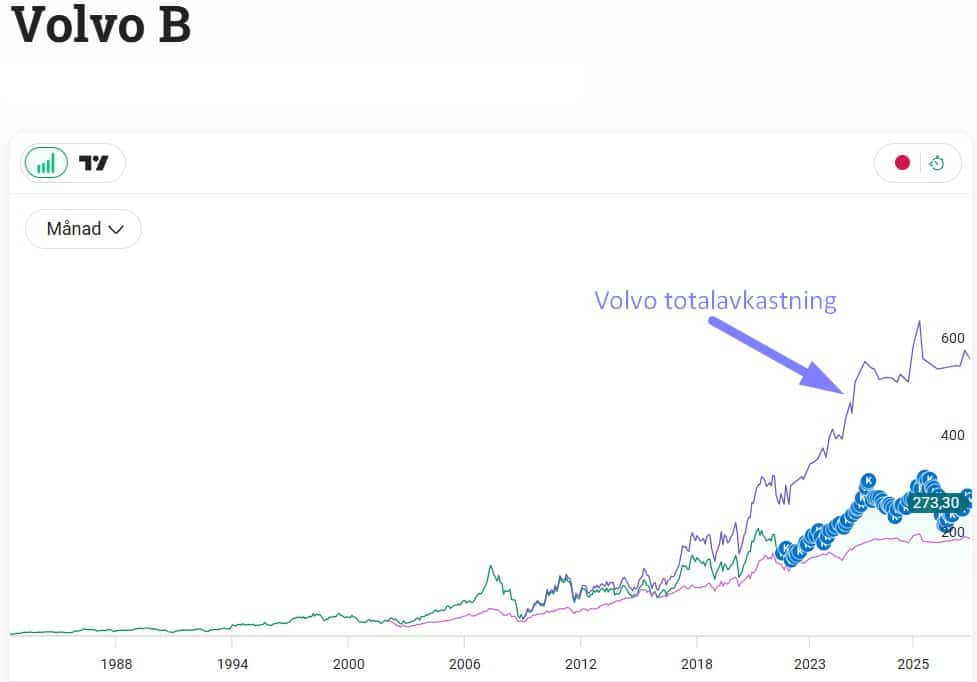 Volvos totalavkastning jämfört med OMXS30GI. Enbart kursutvecklingen har varit starkare. Den översta grafen visar volvos totalavkastning