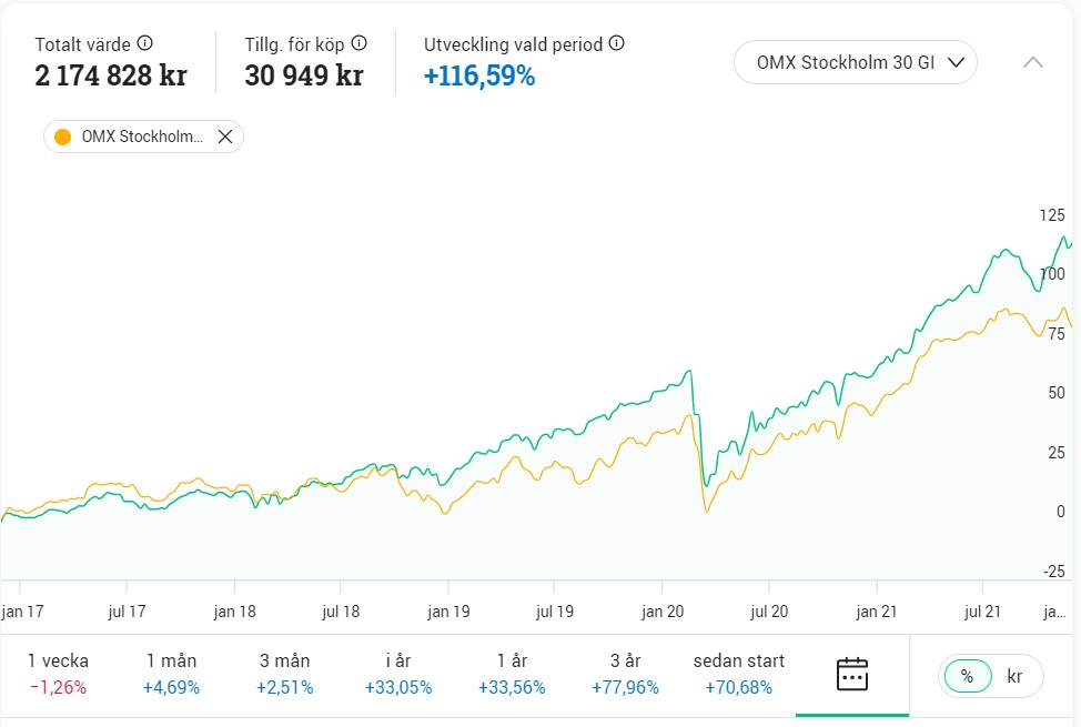 Här presenteras avkastningen de 5 senaste åren. Det här är alltså totalavkastningen (kursavkastning + utdelning) i både min ISK och KF.