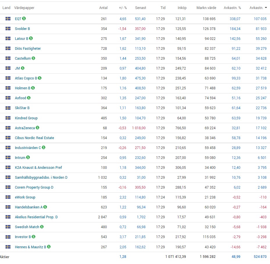 Här är detaljerna för mitt ISK (Investeringssparkonto) där jag samlar mina Svenska aktier. Avkastningen är inte inklusive utdelning för respektive innehav.