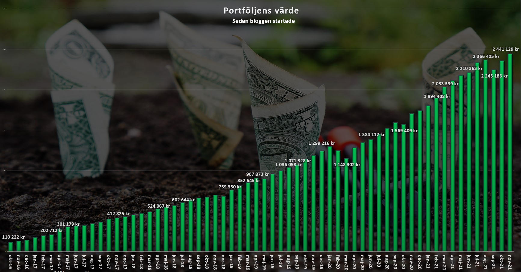 Såhär har portföljens utveckling sett ut över tid. Den här grafen innefattar alltså både kursavkastning, utdelning och nysparande i min egen portfölj. Jag började räkningen från det att jag startade bloggen.