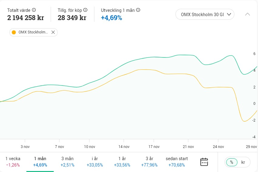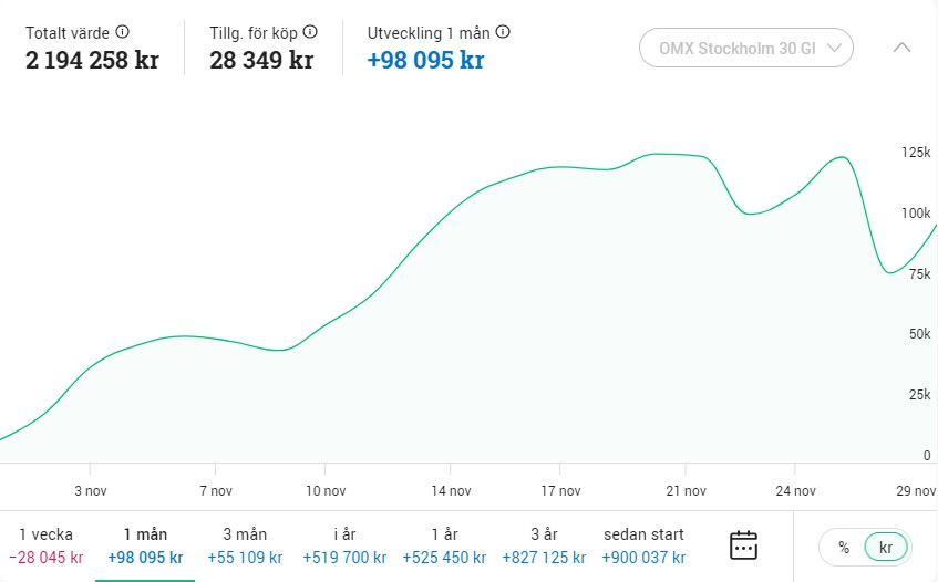 Portföljen är uppdelad i 2 olika kontotyper. De svenska aktierna och fonderna har jag samlat i ett ISK (investeringssparkonto) medan alla utländska finns i en KF (kapitalförsäkring).